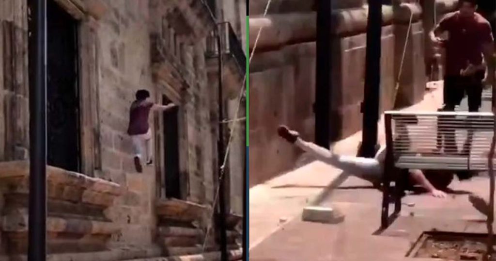 En el clip se puede ver el momento exacto en el que Montesana compensa su falta de atención de niño y ante la presencia de cientos de personas, intenta ir brincando en la fachada del histórico inmueble, lo que saldría mal por todos lados pues al llegar a la ventana, termina por desprender parte de la cantera lo que hizo que cayera al suelo luego de dar varias volteretas en el aire.