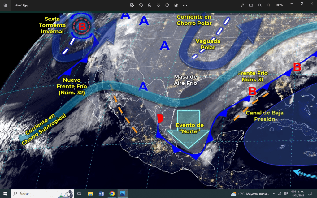 Por otra parte, el frente frío núm. 32 y la sexta tormenta invernal originarán rachas fuertes de viento y lluvias en el noroeste de México.