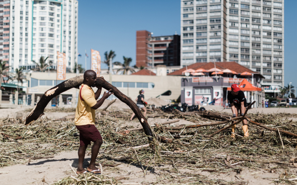 Voluntarios con guantes y bolsas de basura empezaron a limpiar las playas de Durban, que habitualmente están llenas de familias y de turistas.