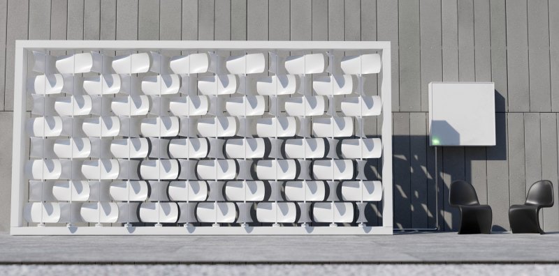 Pero Joe Doucet ha diseñado una pared cinética que se forma por una rejilla de cristales cuadrados que giran al mismo tiempo a lo largo de 25 ejes. Actualmente, se compone por 25 aerogeneradores unidos a varillas verticales con paneles cuadrados adheridos a ellos que impulsan un mini generador de electricidad. El resultado es estéticamente agradable y funcional.