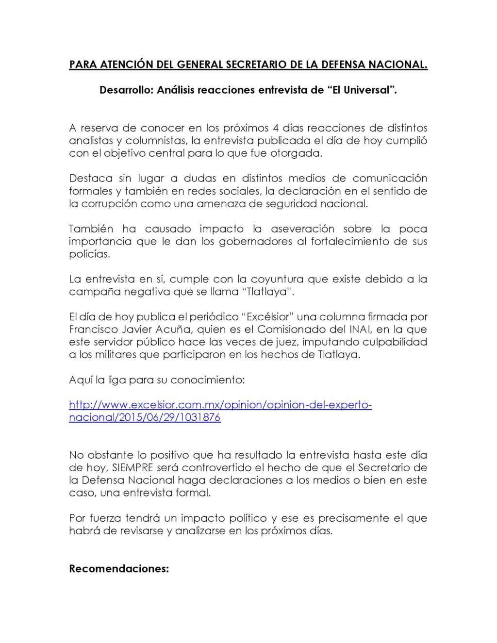 En el mismo análisis, Ibarrola Carreón acusa a quienes escriben una versión distinta a la de la Sedena: “el día de hoy publica el periódico ‘Excélsior’ una columna firmada por Francisco Javier Acuña, quien es el comisionado del Inai, en la que este servidor público hace las veces de juez, imputando culpabilidad a los militares que participaron en los hechos de Tlatlaya. Aquí la liga para su conocimiento […]. No obstante lo positivo que ha resultado la entrevista hasta este día de hoy, siempre será controvertido el hecho de que el Secretario de la Defensa Nacional haga declaraciones a los medios o bien en este caso, una entrevista formal. Por fuerza tendrá un impacto político y ese es precisamente el que habrá de revisarse y analizarse en los próximos días”.