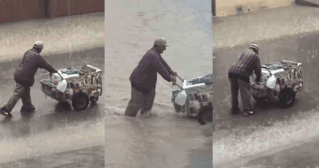 En esta temporada de lluvias se hizo viral en redes un paletero en Coahuila que luchaba contra la corriente de agua en la calle, mientras empujaba empapado su carrito.