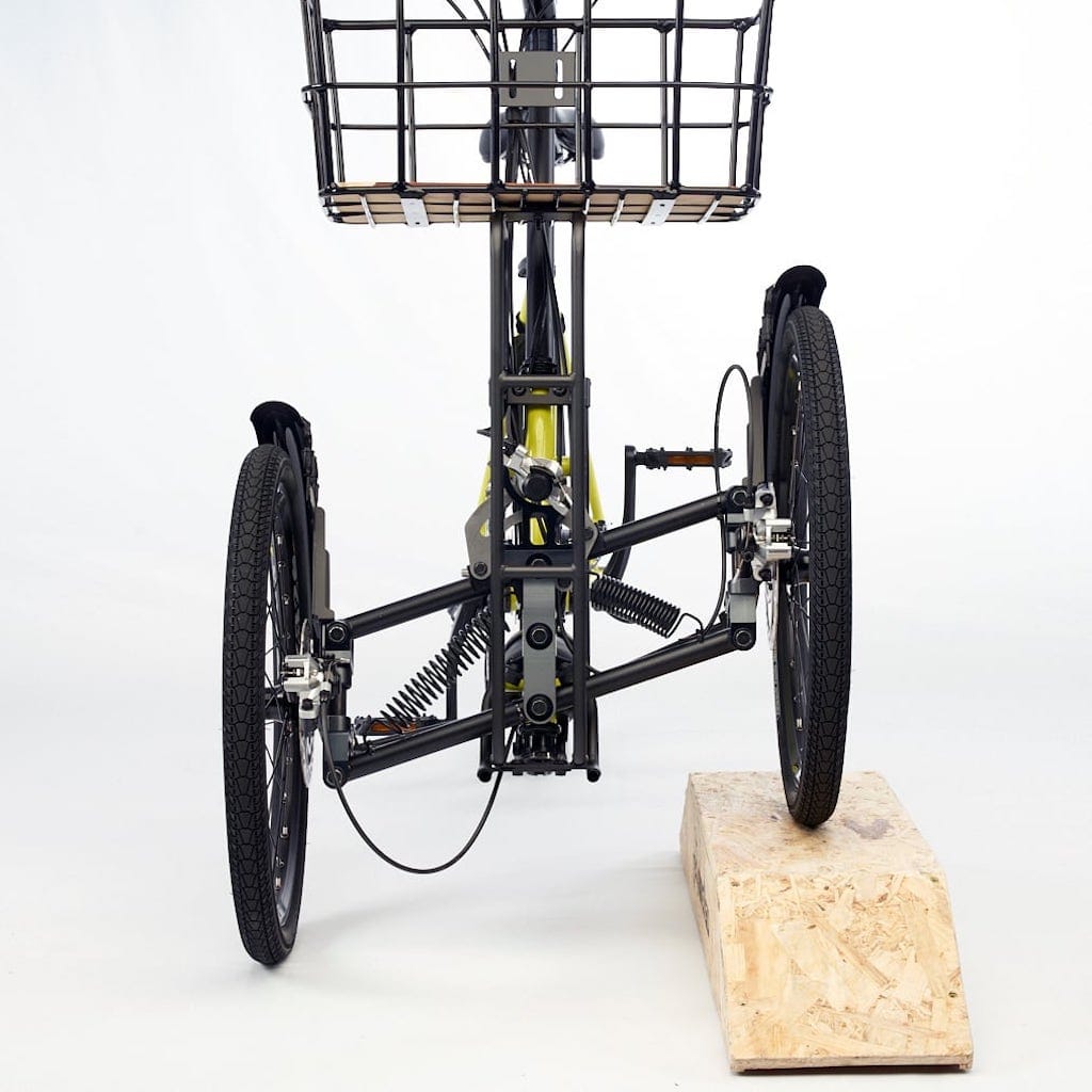 Los frenos de disco mecánicos están presentes en las tres ruedas. Además, el triciclo eléctrico inclinable cuenta con una cesta delantera.