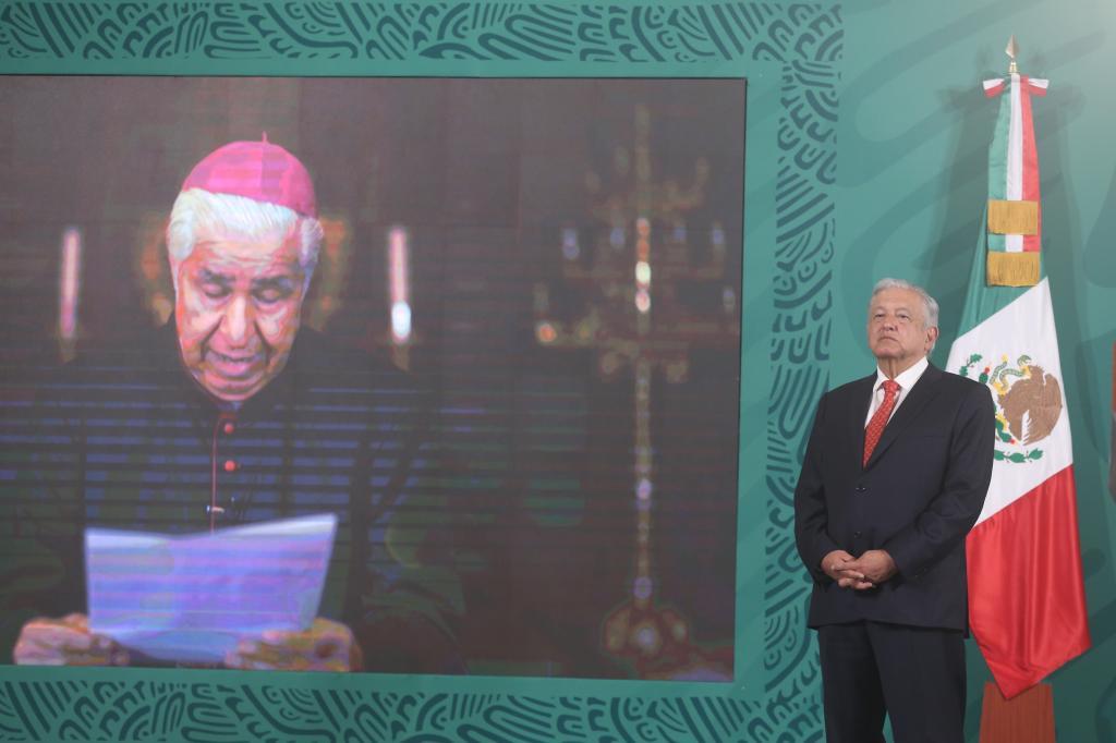 López Obrador escucha un dicurso del cardenal El presidente López Obrador escucha una misiva leída por el cardenal Rogelio Cabrera, arzobispo de Monterrey.EFE