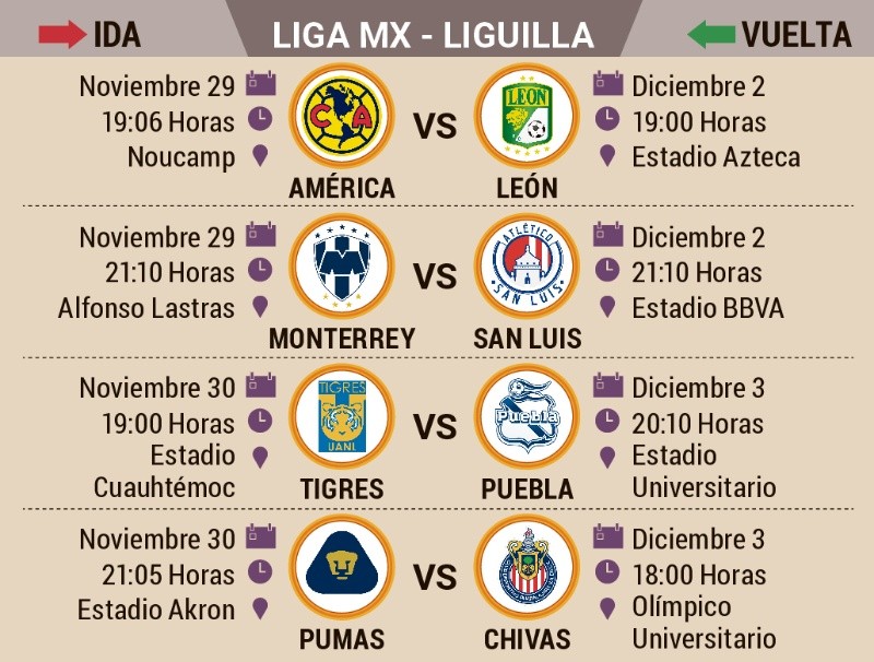 Los partidos de Ida serán León ante América, este miércoles 29 de noviembre, en punto de las 19:06 horas, seguido del Atlético de San Luis frente a Rayados en punto de las 21:10 horas.