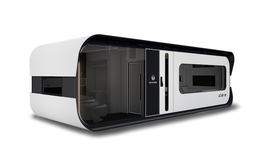 La pequeña y moderna casa prefabricada C2X de Nestron incorpora todos los sistemas de fontanería, electricidad y otros sistemas inteligentes preinstalados, que incluye suelo radiante eléctrico, tableta inteligente y una lavadora de tamaño estándar.