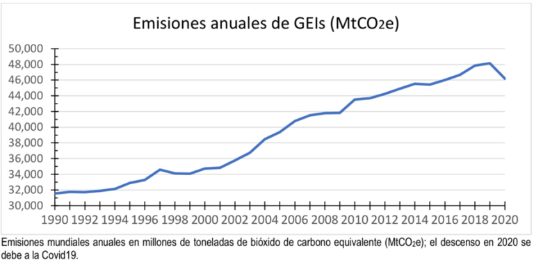 Es necesario aclarar que los datos se refieren al intervalo de las tres décadas con mayores emisiones, comprendido entre 1990 y 2020 (Gráfica al final), lapso en el que 60% de las emisiones de GEIs fueron causadas por tan sólo 10 países: China, Estados Unidos (EUA), India, Rusia, Brasil, Indonesia, Japón, Alemania, Canadá y el Reino Unido. Las emisiones históricas desde 1750 cambian el orden en el que se sitúa cada uno de estos países debido a que resulta incuestionable el hecho de que el país con mayores emisiones es, por mucho, EUA, que sólo dejó de ser el mayor emisor a partir del 2005. En claro contraste, la contribución de los 100 países con emisiones menores de GEIs sólo llega al 3% del total. Estos datos corroboran el hecho de que las emisiones de GEIs de un país, se deben principalmente al estilo de vida de sus habitantes y apuntan claramente a los responsables del calentamiento global.