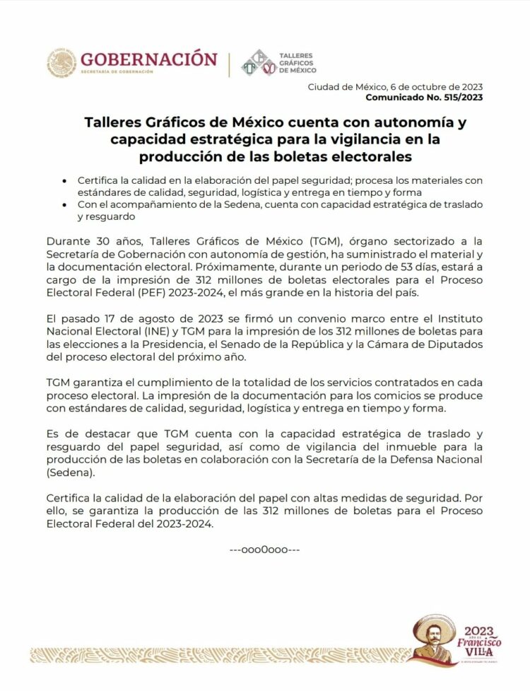 Asimismo, el comunicado menciona que TGM firmó un convenio con el Instituto Nacional Electoral (INE) para la elaboración de las boletas electorales para las elecciones del próximo año 2024 en las contiendas presidenciales, del Senado de la República y la Cámara de Diputados.