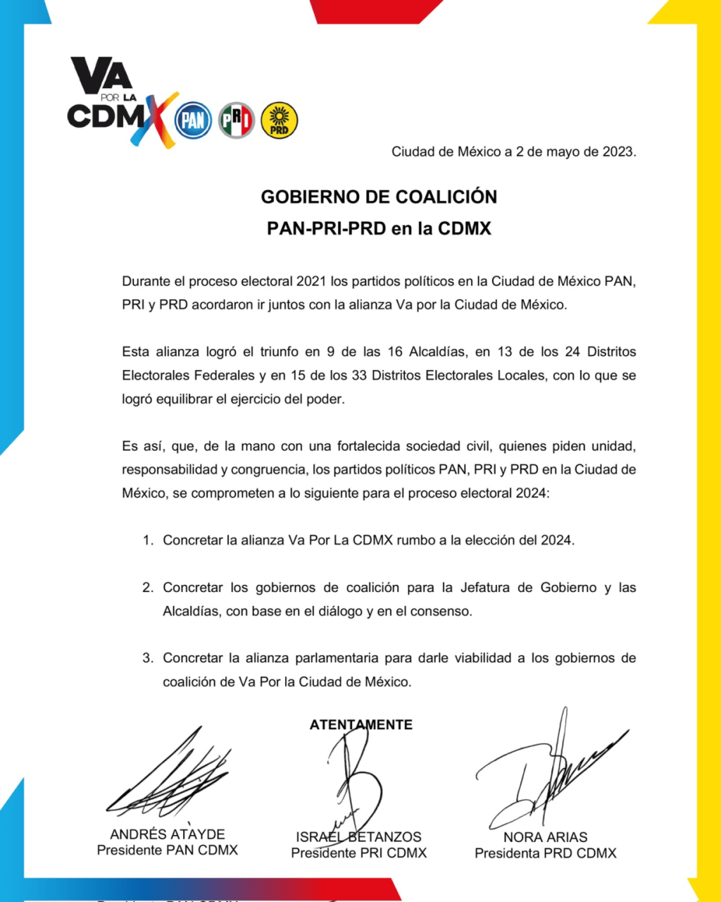 Cabe destacar que esta alianza entre los tres partidos ya se había concretado durante el proceso electoral de 2021 bajo el nombre “Va Por La Ciudad de México“.