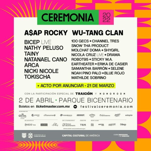 Hace apenas dos días, Ceremonia anunciaba su cartel para la octava partida; A$AP Rocky, un live set de Bicep, Nathy Peluso, Arca, Natanael Cano y Tainy encabezaban el festejo. Pero quedaba un puesto vacante para un headliner más. La noticia de este nuevo cabeza de cartel se dio esta mañana a través de su cuenta de TikTok: El colectivo leyenda del hip-hop, Wu-Tang Clan se une al cartel.