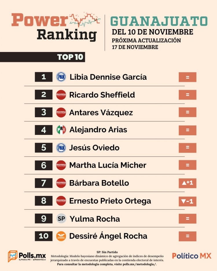 El Power Ranking de Guanajuato de Polls MX, presentado semanalmente, NO es una encuesta. Es un modelo que jerarquiza la fuerza política de los aspirantes a la gubernatura de Guanajuato en las elecciones 2024 tomando en cuenta careos públicos e hipotéticos entre rivales de diferentes partidos, así como la relevancia mediática y conversacional de las casas encuestadoras. La próxima actualización del Power Ranking de Guanajuato se publicará el 17 de noviembre de 2023.