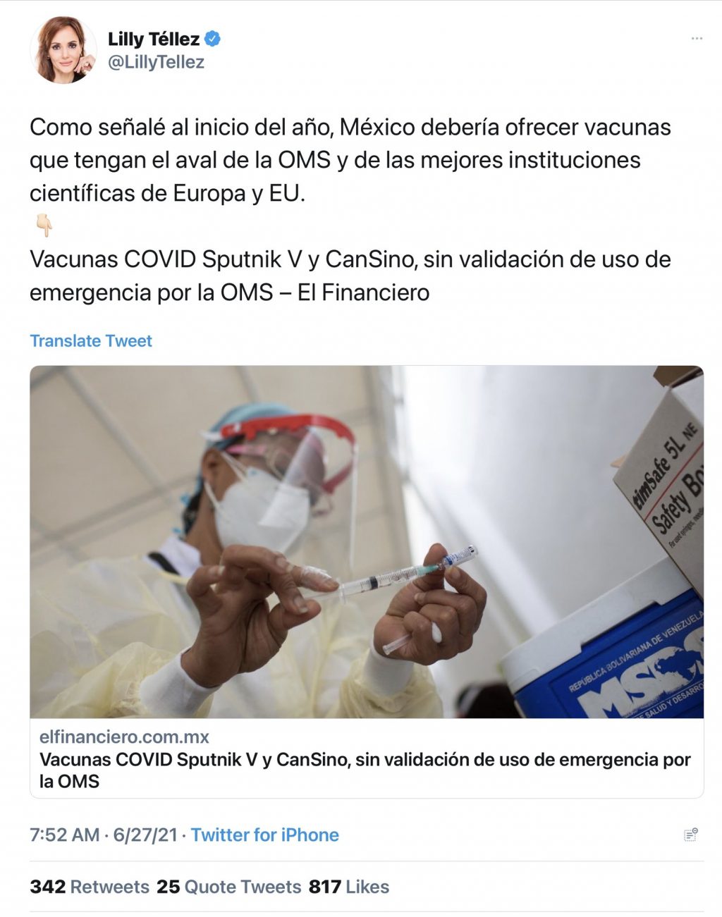 Lilly Téllez, quien ya ha sido señalada en ocasiones anteriores por difundir desinformación con respecto a las vacunas anticovid, especialmente contra las que se fabrican en China y Rusia; países cercanos a gobiernos de izquierda como Cuba, Venezuela y Bolivia, compartió un artículo de El Financiero en el que se sugiere que la Sputnik y la CanSino son inseguras.