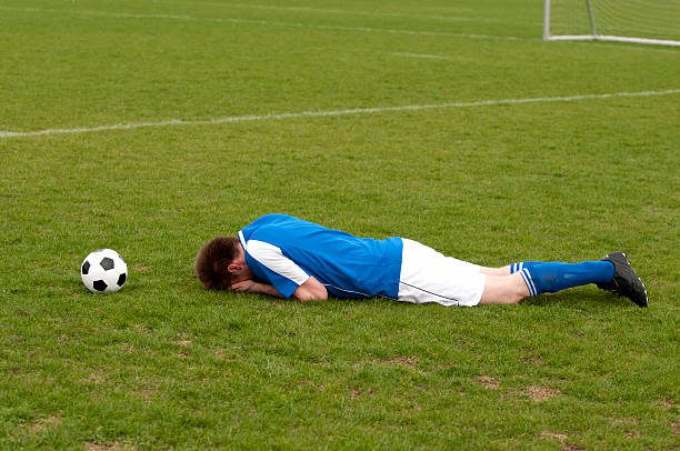 Soccer player in pain facing the ground. His hands cover his eyes. Soccer ball in front of him. Goal blurred in the background.