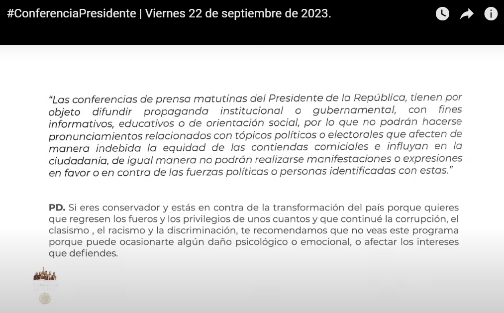 «Y voy a agregar uno que va a decir, palabras más, palabras menos: si eres conservador y estás en contra de la transformación del país porque quieres que regresen los fueros y los privilegios de unos cuantos y que continúe la corrupción, el clasismo, el racismo y la discriminación te recomendamos que no veas este programa porque puede ocasionarte algún daño psicológico o emocional, o afectar los intereses que defiendes», ironizó el presidente López Obrador.