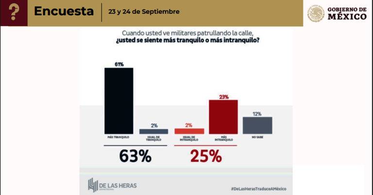 Asimismo, María de las Heras preguntó a los mexicanos: Cuando usted ve a militares patrullando la calle, ¿se siente más tranquilo o más intranquilo? Lo resultados arrojaron que 61% respondió que se sentía más tranquilo, mientras que solo 23% dijo lo contrario.