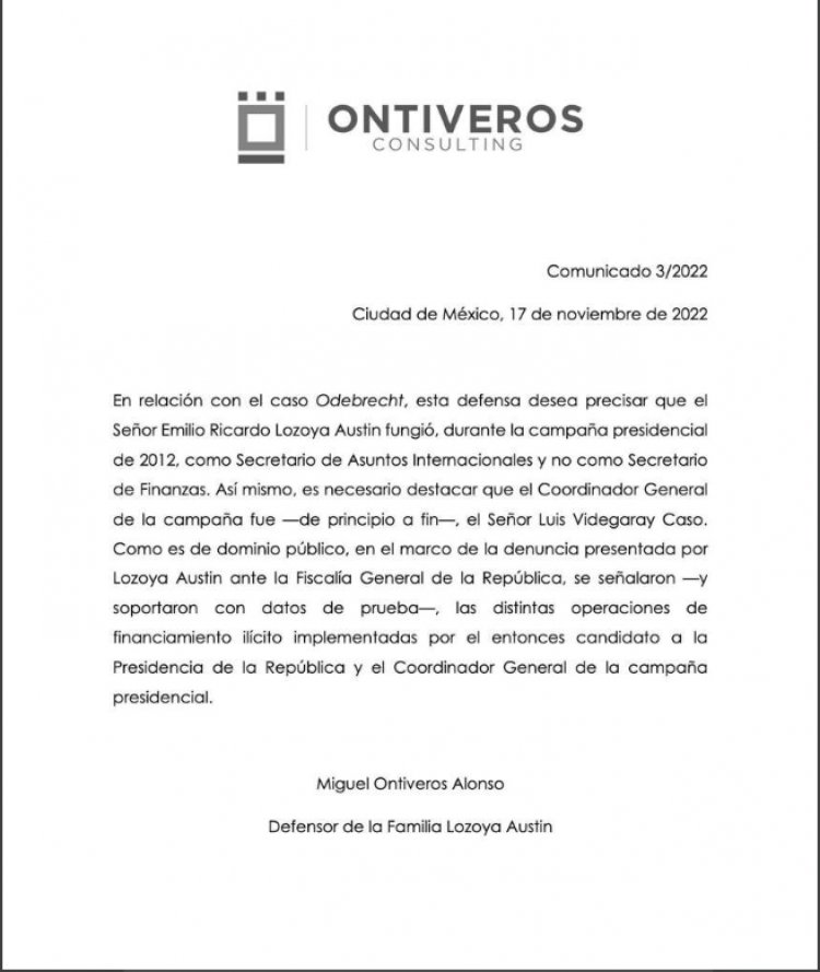 A través de un comunicado, el equipo de abogados de la familia Lozoya Austin acusó que en relación al caso Odebrecht, durante la campaña presidencial de Peña Nieto él no fungió como secretario de finanzas, sino como secretario de Asuntos Internacionales.