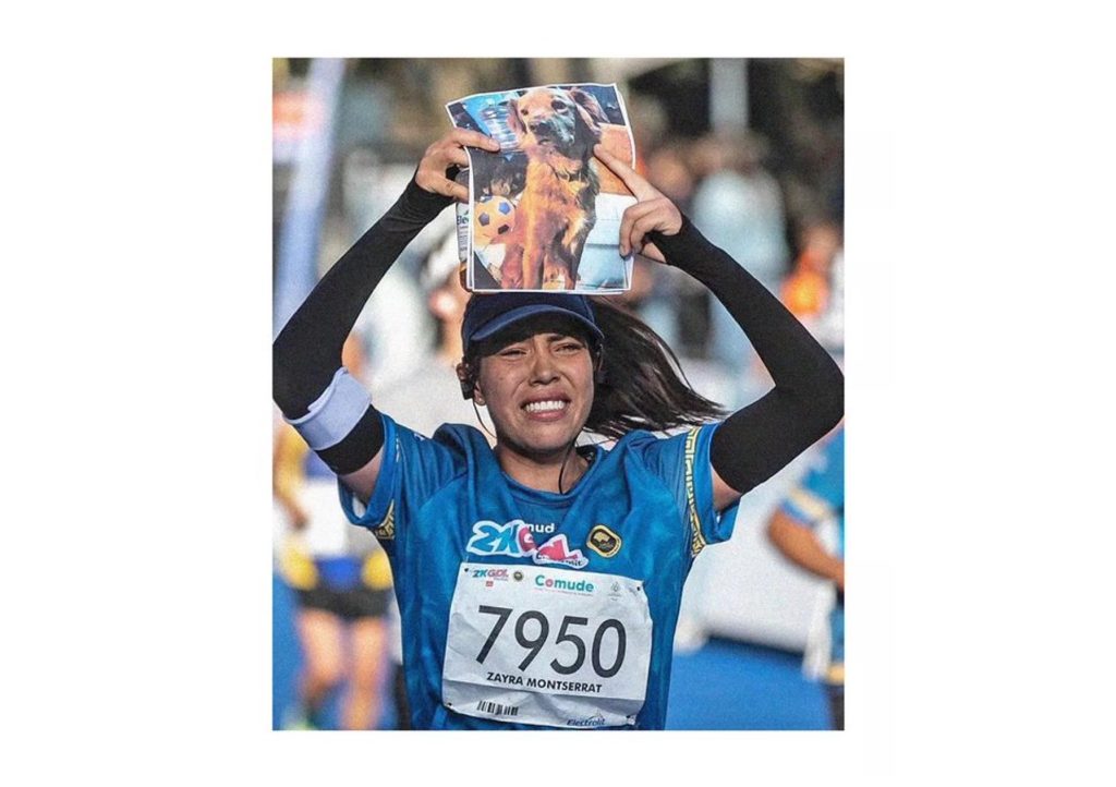 Guadalajara, Jal., 1 de marzo de 2023.- Durante el Medio Maratón de Guadalajara, realizado el domingo 26 de febrero, la atleta Zayra Montserrat Zeferino cruzó la línea de meta con la foto de su perrita Lya, la cual falleció unos días antes de la competencia.