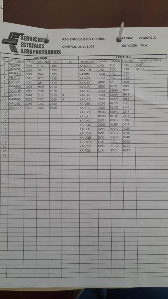 Otros documentos, obtenidos del Control de Vuelos de los Servicios Estatales Aeroportuarios, dan cuenta que el Learjet 75, con matrícula XA-MBD, utilizó instalaciones de la empresa Rajet en los hangares del aeropuerto de Saltillo.