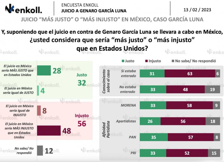 En tanto, del total de los encuestados, a la pregunta de que suponiendo que el juicio contra García Luna se llevara a cabo en México, ¿usted considera que sería “más justo” o más injusto” que en Estados Unidos?