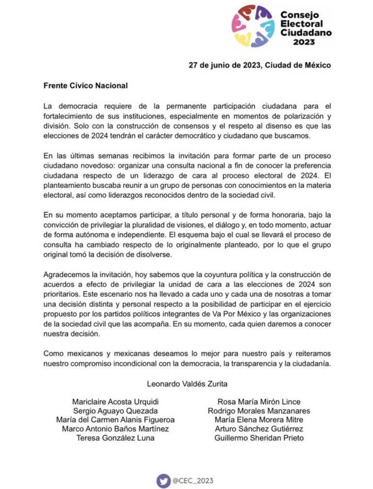 En su pronunciamiento, recordaron que en las últimas semanas recibieron una invitación para formar parte de “un novedoso proceso ciudadano: organizar una consulta nacional para conocer las preferencias ciudadanas respecto a un liderazgo de cara al proceso electoral de 2024. El objetivo era reunir a un grupo de personas con conocimientos en materia electoral y líderes reconocidos dentro de la sociedad civil”, mejor conocido como Mini INE.