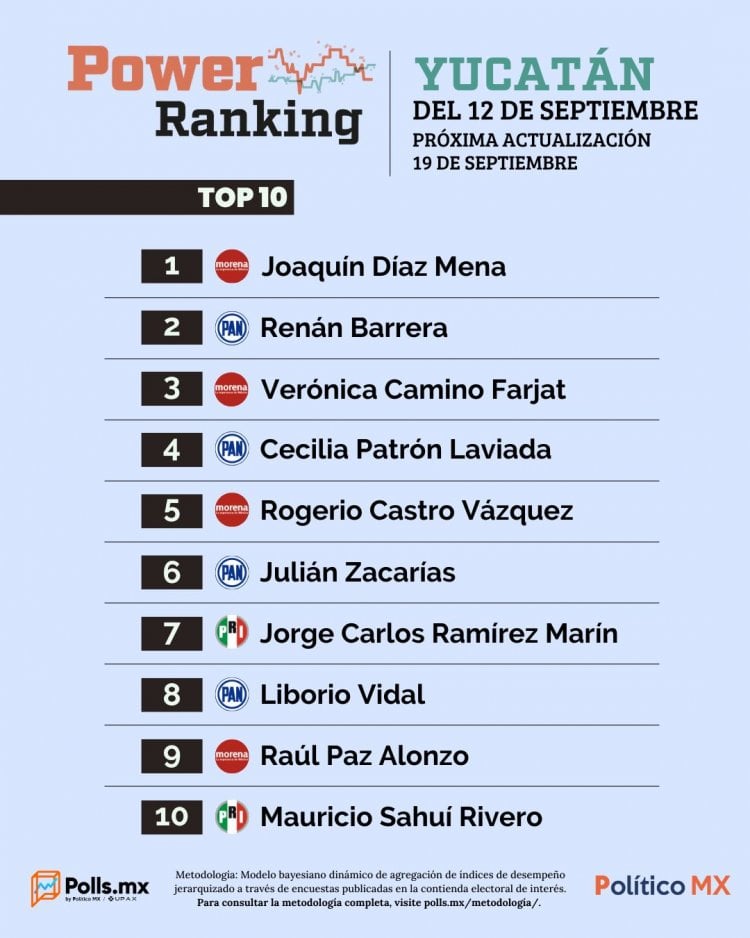 Rumbo a las elecciones de 2024, Polls MX estrena el Power Ranking de Yucatán, que dará seguimiento a la contienda por la gubernatura de la entidad, gobernada por el PAN. En su primera semana Morena dio la sorpresa y se posicionó a la cabeza con Joaquín Díaz Mena, seguido del panista Renán Barrera.