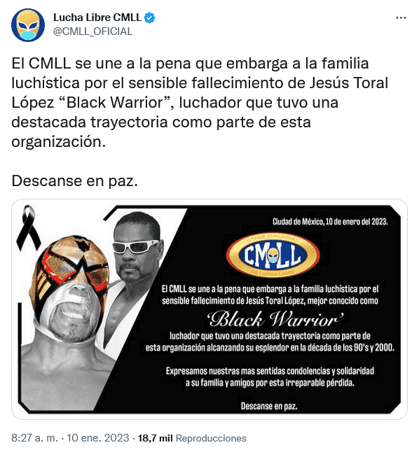 «El CMLL se une a la pena que embarga a la familia luchística por el sensible fallecimiento de Jesús Toral López «Black Warrior», luchador que tuvo una destacada trayectoria como parte de esta organización. Descanse en paz», lamentó el ente luchístico en sus redes sociales.