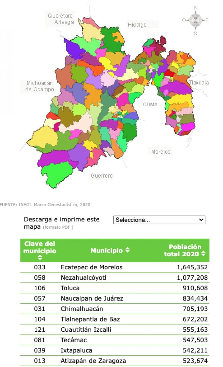 De acuerdo con el Instituto Nacional de Estadística y Geografía (INEGI) en 2020 los 10 los municipios más poblados del Estado de México son: