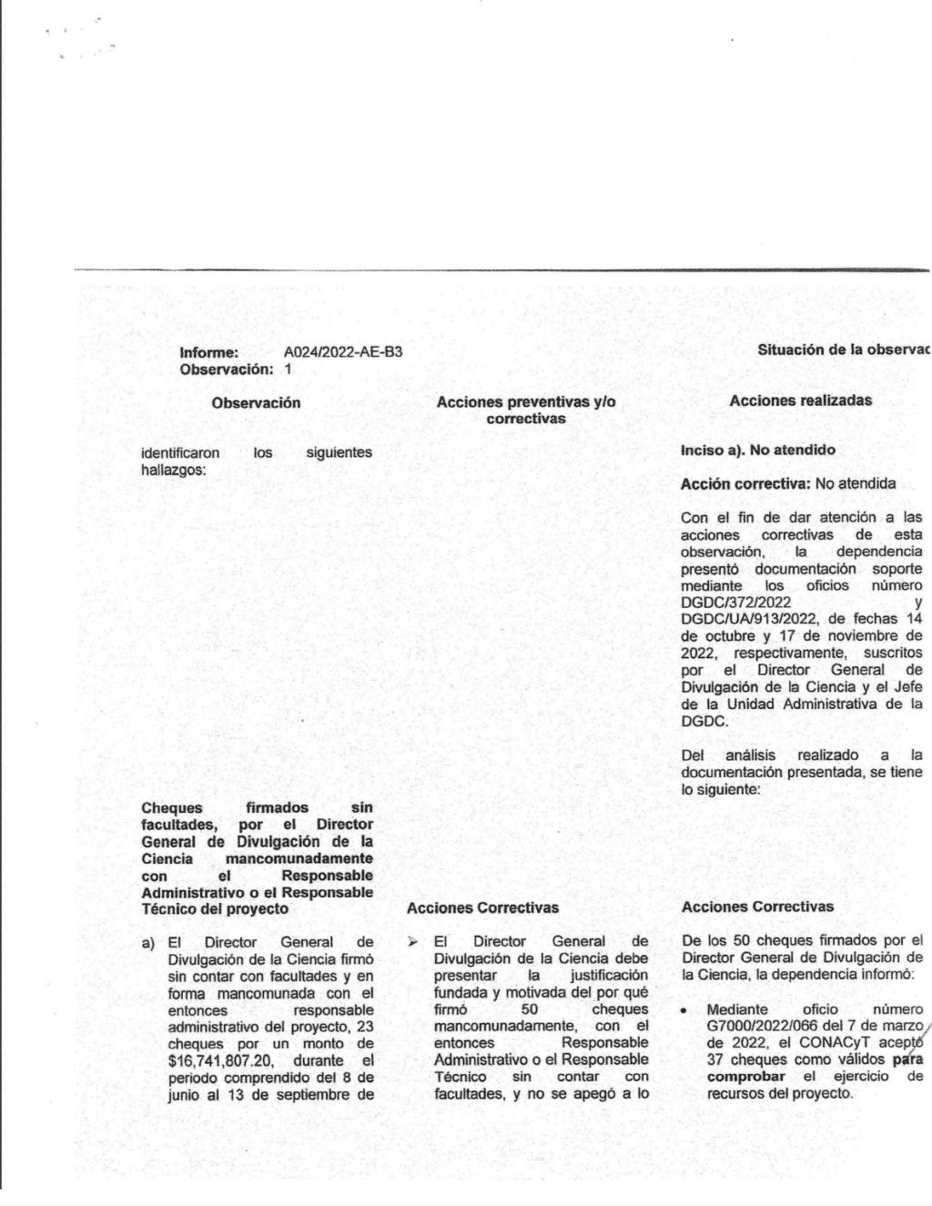 En el documento, la Contraloría universitaria emite acciones correctivas y señala: “El Director de Divulgación de la Ciencia debe presentar la justificación fundada y motivada del por qué firmó 50 cheques mancomunadamente, con el entonces Responsable Administrativo [Daniel Zamora Fabila] o Técnico [José Ramón Hernández Balanzar] sin contar con facultades [sic]”.