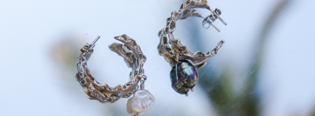 Su primera colección, Bosques subacuáticos, está inspirada principalmente en las algas. Aretes, anillos, collares que fungen como un amuleto para anclarnos y recordarnos nuestra conexión con todo lo que nos rodea.