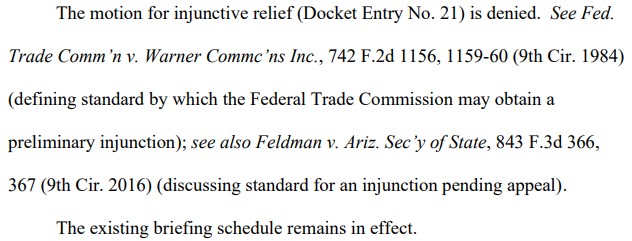 Técnicamente ambas compañías solo deben esperar hasta las 11:59 pm hora de California de hoy para poder proseguir con la operación de compra de casi 70mil millones de dólares. Hora en la que expira la orden de restricción temporal que emitió la misma juez Corley en lo que se llevaban las audiencias que presidió, y en las que se basó para denegar la petición original de la FTC.
