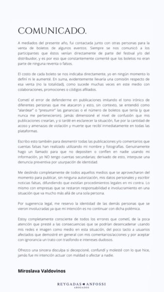 Asesorada por el despacho de abogados Reygadas Y Anfossi, Miroslava Valdovinos realizó una reconstrucción de los hechos según su perspectiva, en la que relata que a mediados de este año fue contactada para que vendiera boletos de algunos espectáculos en vivo y estos venían directamente del distribuidor oficial.