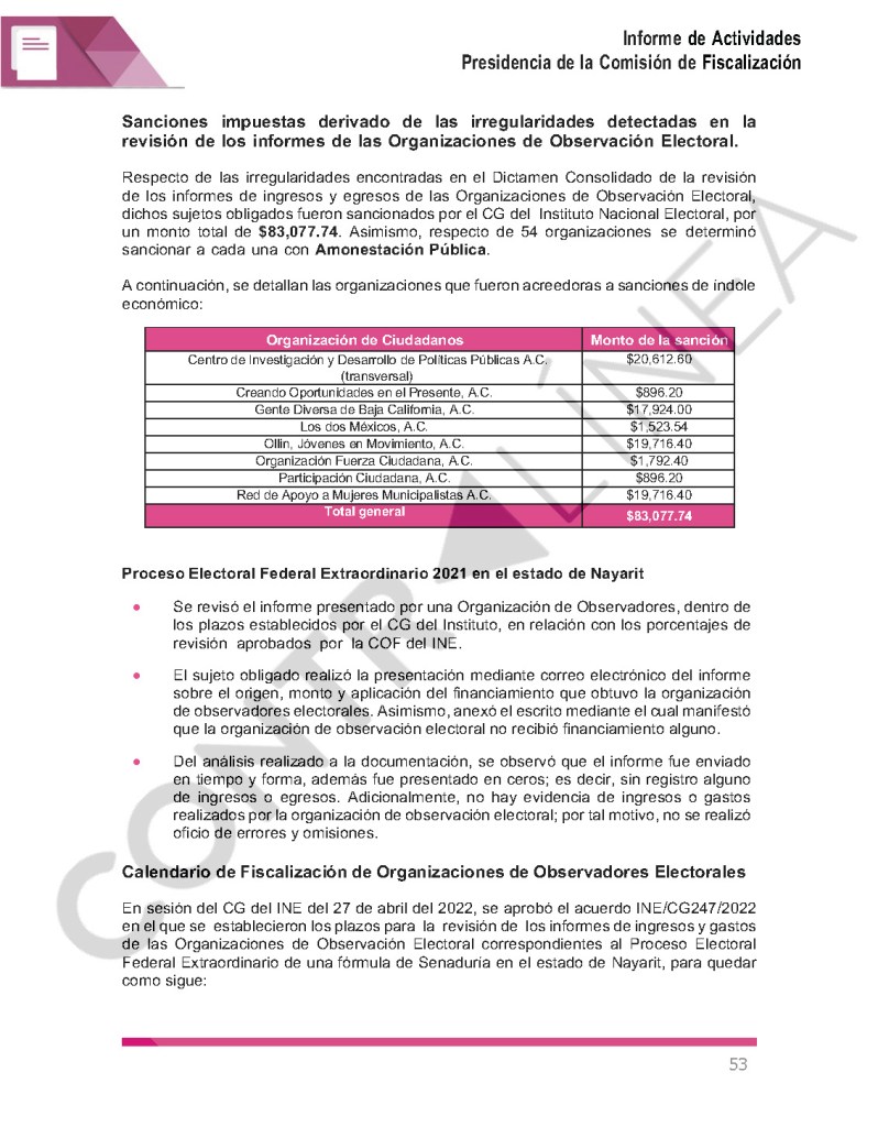 A esta crítica se suma el hecho de que la propia Comisión de Fiscalización del INE ha detectado irregularidades e impuesto sanciones a las asociaciones civiles. De ello hay constancia en el Informe de actividades, septiembre 2021- marzo 2023, de la Comisión de Fiscalización, donde se da cuenta de las “sanciones impuestas derivado de las irregularidades detectadas en la revisión de los informes de las organizaciones de observación electoral”: multas por 83 mil 77 pesos, y amonestación pública a 54 organizaciones.