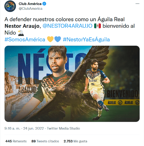 «Hola a todos mis seguidores, gracias por su apoyo, les tengo una noticia… tranquilos azulcremas, ya soy águila», fue el mensaje con el que Araujo se presentó en redes sociales como nuevo jugador del América.