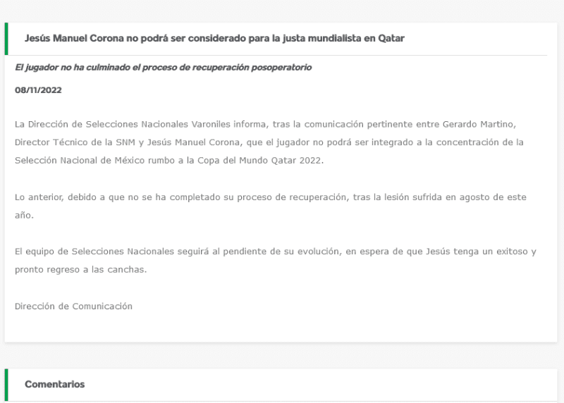 ¡Es oficial! La Dirección de Selecciones Nacionales confirma que Jesús «Tecatito» Corona no ha culminado el proceso de recuperación postoperatorio, por lo que se perderá el Mundial de Qatar 2022.