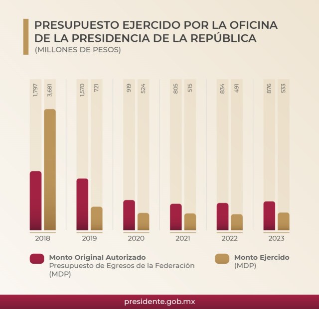 Al exponer un comparativo del presupuesto ejercido por la Oficina de la Presidencia de la República de 2018 a 2023, el mandatario destacó que el periodo correspondiente a la Cuarta Transformación se caracteriza por la continua reducción en el monto autorizado en el Presupuesto de Egresos de la Federación.