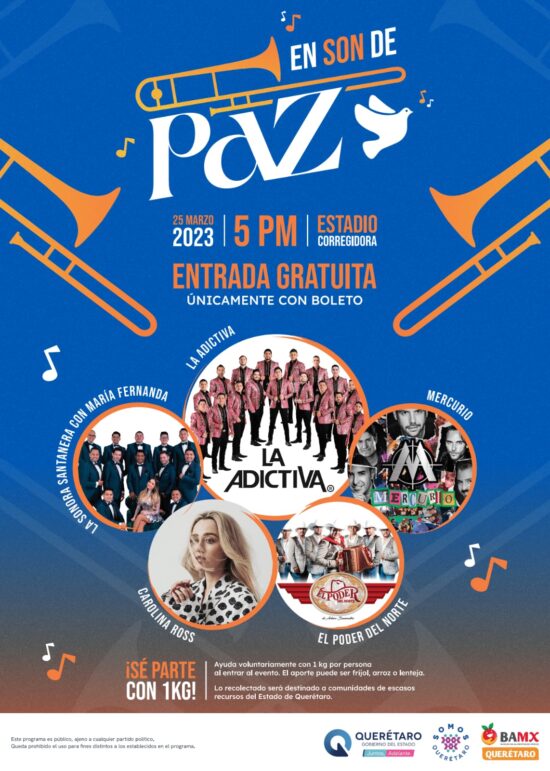 Querétaro, Qro., 8 marzo de 2023.- El gobierno de la entidad organiza el concierto gratuito En Son de Paz, que se realizará el próximo 25 de marzo a las 17 horas en el Estadio La Corregidora. La entrada será con boletos, los cuales serán regalados a partir del 13 de marzo en medios de comunicación.