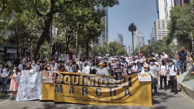 El contingente se reunió en punto de las 11 de la mañana de este sábado a la altura del Ángel de Independencia exigiendo que se regularice el abastecimiento de medicamentos necesarios para los tratamientos correspondientes al cáncer.