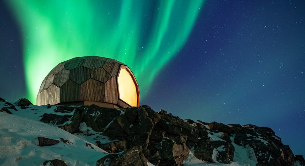En Noruega hay otras ubicaciones como Svalbard donde las temperaturas son tan bajas que alcanzan los -30°C y la aventura de cazar auroras boreales se vuelve placentera si las miras a través este refugio de grandes ventanales, cobijado con abrigadoras mantas, un chocolate caliente en la mano y sin salir de tu cama.