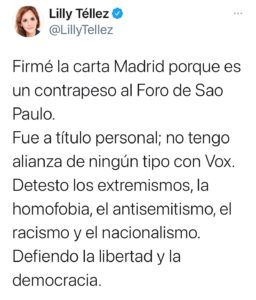 Otra persona que defendió su encuentro con el dirigente derechista fue la senadora Lily Téllez, una de las firmantes del documento. A través de la misma plataforma, aseguró firmó porque está a favor de ‘la democracia y la libertad’ y detesta el extremismo, el racismo, la homofobia, el antisemitismo y el nacionalismo, a pesar de que Abascal y VOX enarbolan dichos principios.