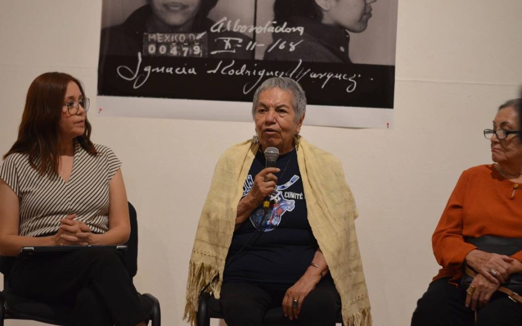 Acompañada también de Elizabeth Cejudo, Rosa Maria O Leary, Silvia Núñez Esquer y Celeste Taddei, y con su ficha policiaca 00479 de fondo (en la que se le señala de “Alborotadora”), «La Nacha» Rodríguez Márquez recordó cómo se inició en el activismo a través del Comité de Lucha de la Facultad de Derecho tras haber presenciado la represión brutal de los granaderos que realizaban impunemente hacia los estudiantes de aquella época.