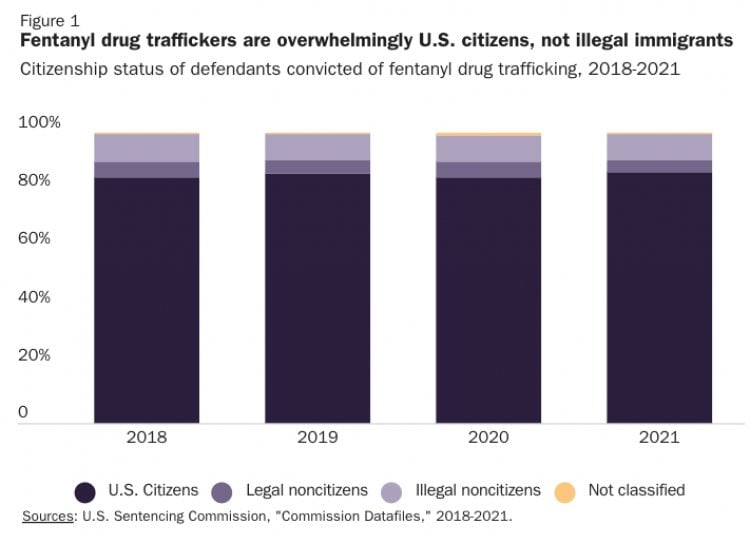 En el documento, cuyo autor es David J. Bier, experto en inmigración legal y seguridad fronteriza, señaló que en 2021 más del 85% de los condenados por fentanilo en EUA eran personas de ciudadanía estadounidense, esto representa diez veces el porcentaje de condenas a inmigrantes ilegales por el mismo delito. Además sólo el 0.02% de las personas arrestadas por la Patrulla Fronteriza por cruzar ilegalmente poseían fentanilo.