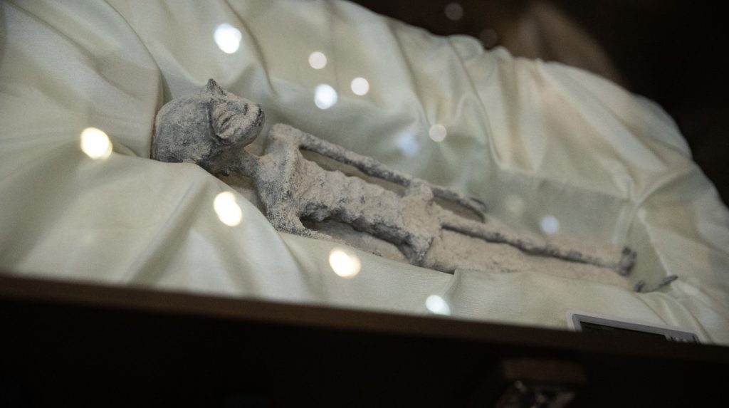 A la reunión se presentó Jaime Maussan, un ufólogo y periodista de ese país norteamericano. El “plato fuerte” del evento se sirvió cuando el especialista en la materia expuso dos cuerpos momificados que, se presume, tienen más de mil años. Estos fueron hallados en 2017, entre las ciudades de Palpa y de Nazca, Perú.