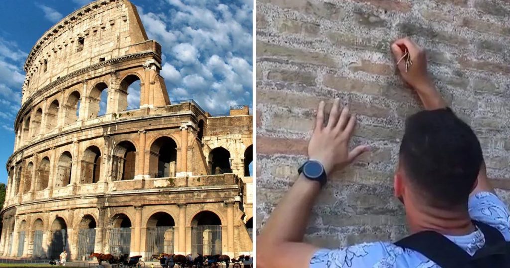 Que graciosito: Turista escribe el nombre de su novia en el Coliseo y todavía hasta se rió