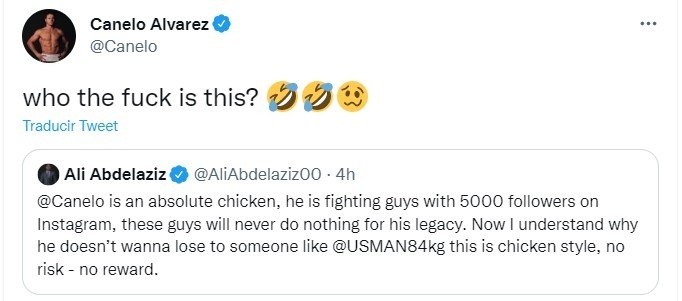 Fue en una publicación de Twitter, donde Ali Abdelaziz, descalificó al «Canelo» llamándolo «gallina» por pelear contra pugilistas con 5000 seguidores en Instagram que no harán nada para su legado y que ahora entiende por qué le huye a pelear contra Kamaru Usman, un peleador de artes marciales mixtas.