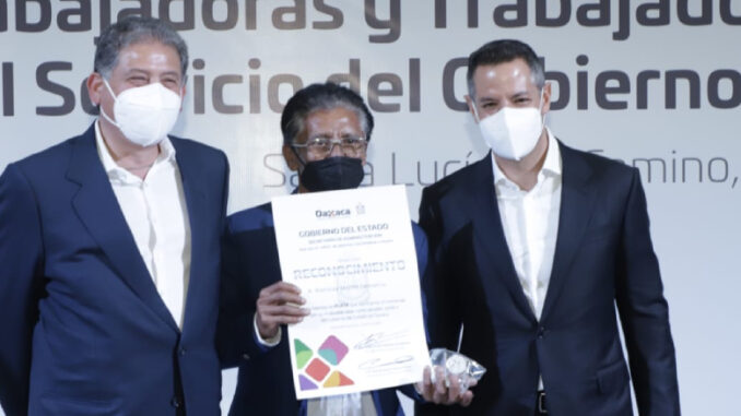 Durante el acto simbólico de entrega de alrededor de 898 reconocimientos y medallas de oro y plata a servidoras y servidores públicos que cumplieron 20, 25 y 29 años de servicio de laborar en el Gobierno del Estado, el secretario de Administración, Germán Espinosa Santibáñez, destacó el esfuerzo de quienes han sabido cumplir con su labor, al dedicar más de dos décadas de vida a favor de Oaxaca y de la sociedad, muchas y muchos de ellos aún en tiempos de pandemia.