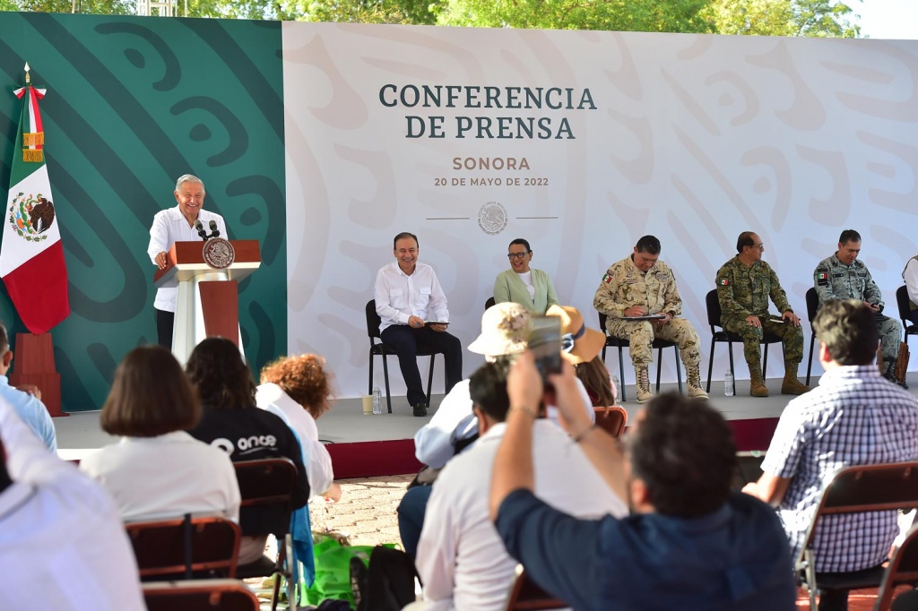 (20 DE MAYO, 2022).- La mañana de este viernes, el presidente Andrés Manuel López Obrador encabezó la reunión de seguridad y la conferencia de prensa matutina en Sonora; expresó su respaldo a la población de la entidad y sostuvo que tiene presupuesto asegurado para impulsar la estrategia de pacificación.
