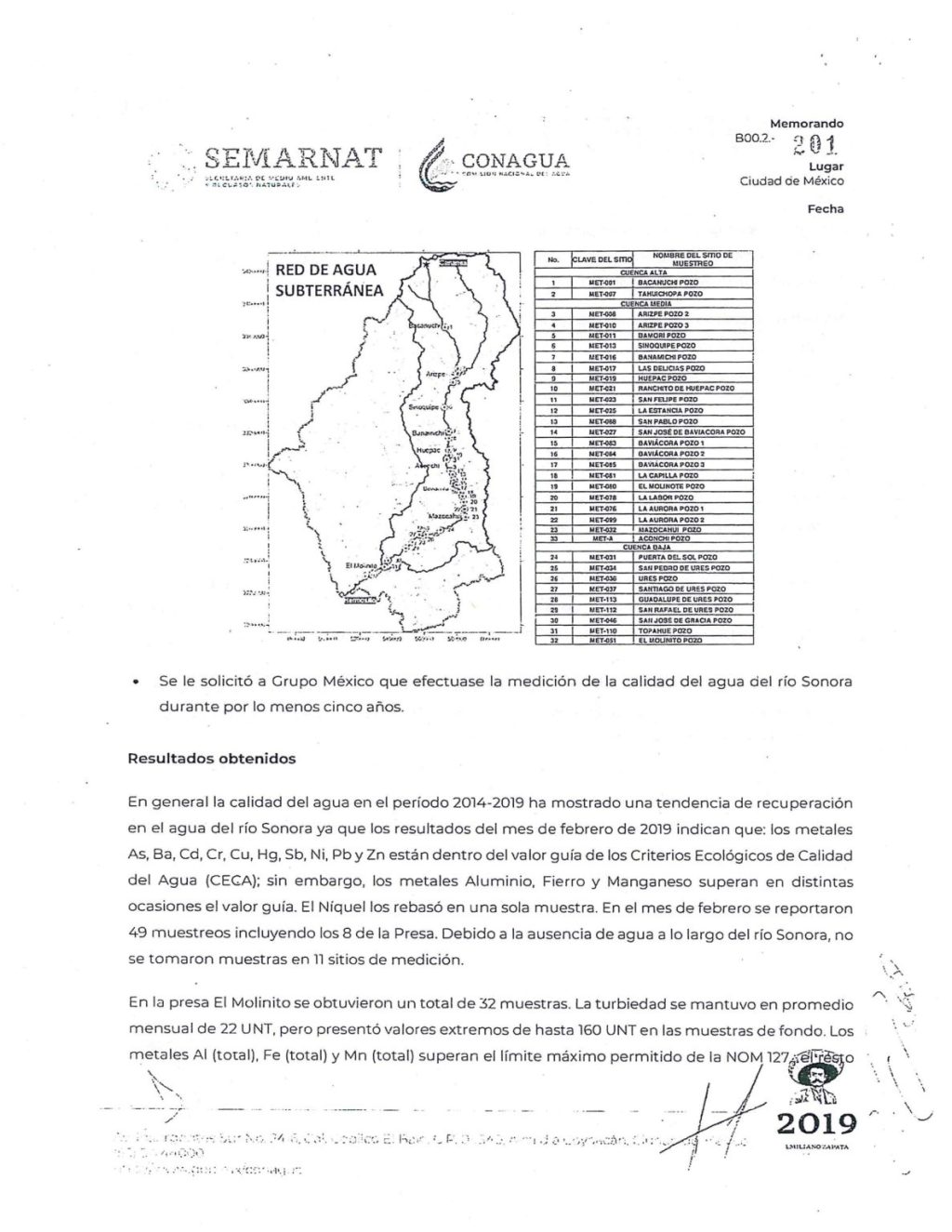 Firmado por Juan Ernesto García Corona, en aquel tiempo gerente de Inspección y Medición, y Erick Daniel Gutiérrez López, entonces gerente de Calidad del Agua, el memorando señala: “en general la calidad del agua en el periodo 2014-2019 ha mostrado una tendencia de recuperación en el agua del río Sonora, ya que los resultados del mes de febrero de 2019 indican que: los metales […] están dentro del valor guía de los Criterios Ecológicos de Calidad del Agua […]” (sic).