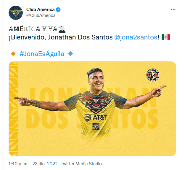 Las Águilas del América le adelantaron la Navidad a sus aficionados, al anunciar este jueves antes de Navidad que Jonathan dos Santos será su jugador para el Torneo Clausura 2022.