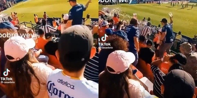En un video que circula en redes sociales, se puede ver a Rogelio Funes Mori convirtiendo un gol de penal y un aficionado de Rayados se paró a festejar en medio de los potosinos que no dudaron en arrojarle sus bebidas uno tras otro.