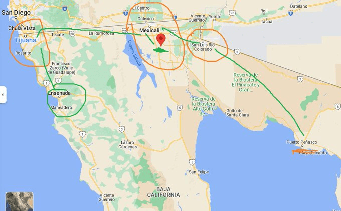 Esto es tender unas líneas de transmisión eléctrica desde San Luis Río Colorado a Mexicali, aprovechando las subestaciones y líneas que se tienen en Sonora (en círculos).